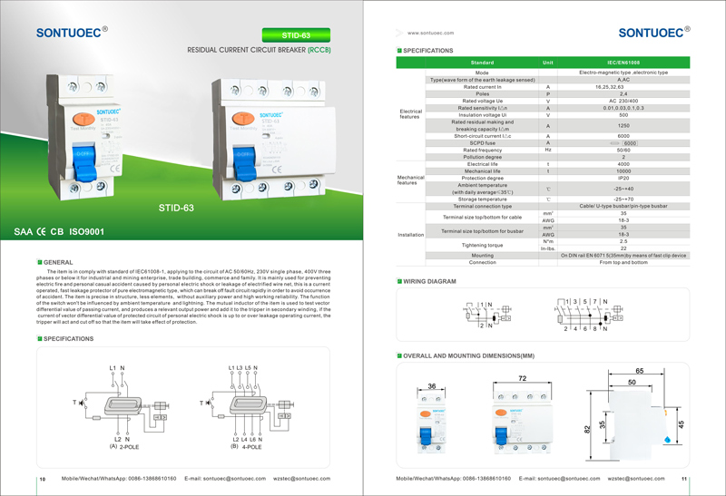 SONTUOEC je jedným z čínskych dodávateľov/výrobcov špecializujúcich sa na výrobu rôznych malých elektrospotrebičov. Prúdový istič série STID-63 230V 63A môže okamžite prerušiť poruchový obvod v prípade nebezpečenstva úrazu elektrickým prúdom alebo zemného zvodu z diaľkového vedenia. Preto je vhodný na zabránenie nebezpečenstvu úrazu elektrickým prúdom a požiaru spôsobenému zemným zvodom. Môže byť použitý v obvodoch až do jednofázového 240V, trojfázového 415V, Hz V súlade s normou IEC61008-1.